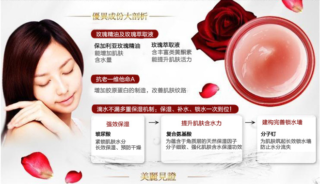 The Bulgarian rose oil (Rosa Damascana) can increase the water retention, the rose extract (Rosa Centifolia) that has rich kind of flavonoid element, can promote the skin immune; The natural rose smell can let you feel happy.