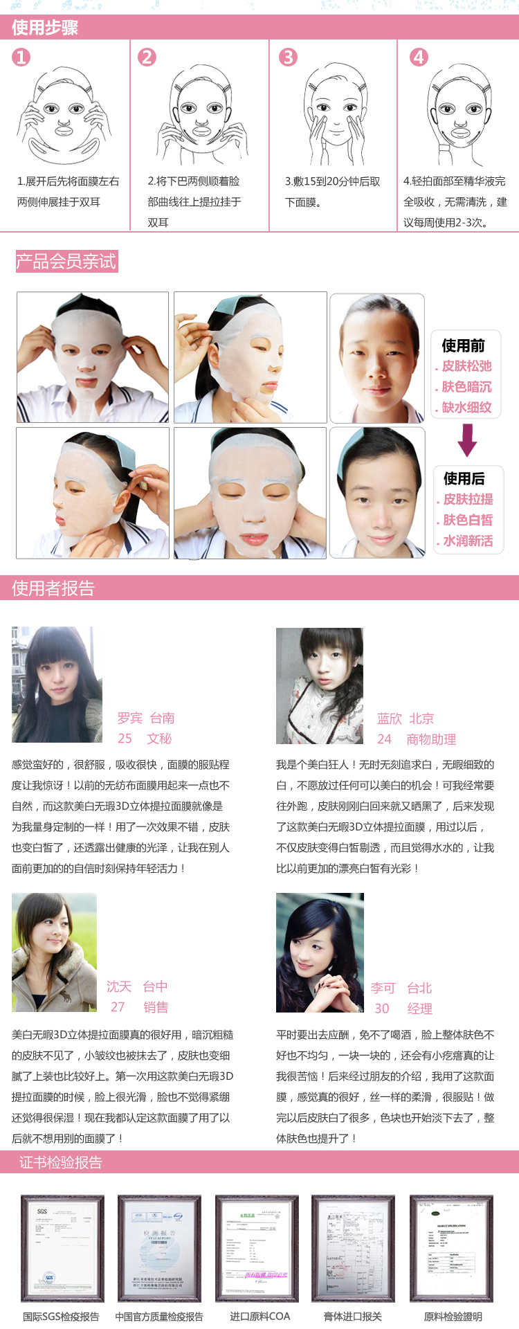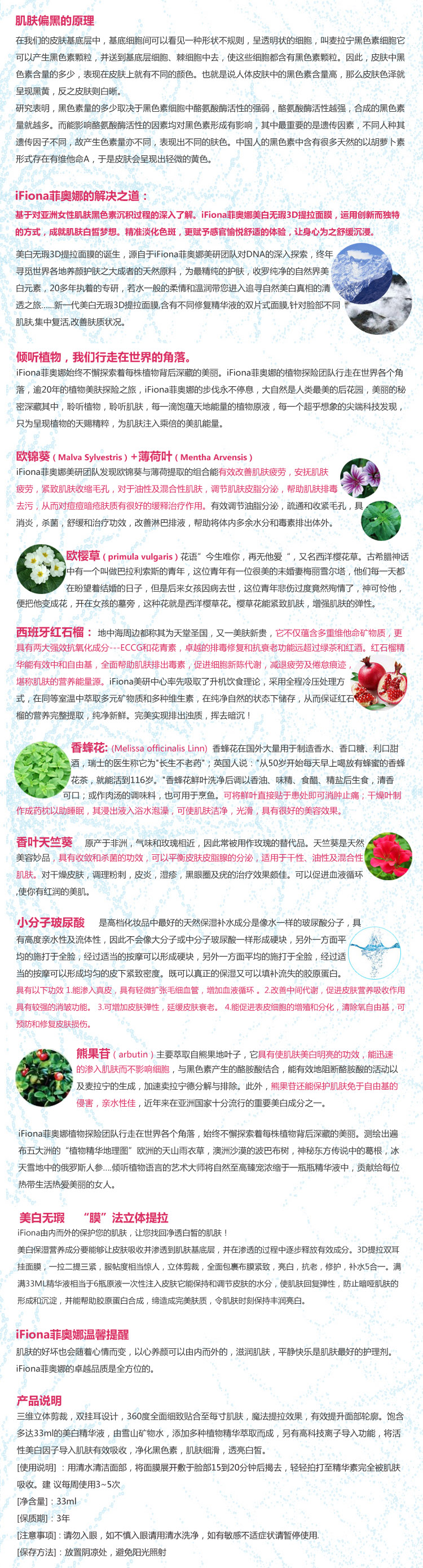 Description : �ʺϷ��ʣ��κμ��������м���Ҳ�ɷ���ʹ�� ��ά������ã�˫�Ҷ�ʽ��ƣ�360��ȫ��ϸ��������ÿ�弡����ħ������Ч�����������沿�׶أ��������33ML ���׾���Һ����ѩɽ����ˮ�����Ӷ�����Ȼֲ����ȡ���ɣ����и߿Ƽ����ӵ��빦�ܣ��������������ӵ��뼡�����գ�������ɫ�أ���������ϸ����������𪡣��