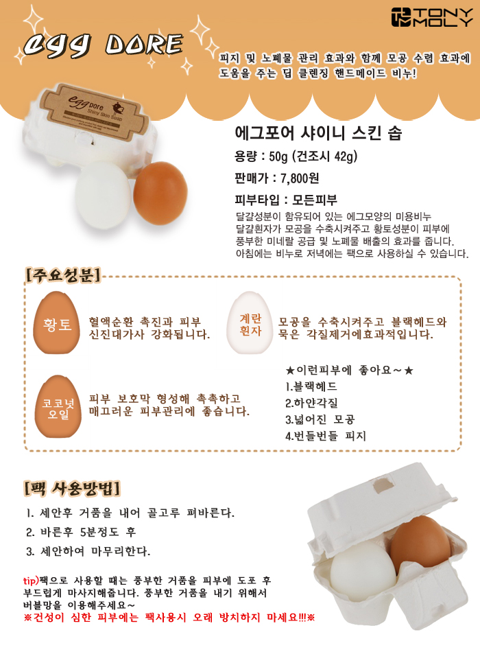 ����Ҫ��Ч��ȥ����ͷ�۴̣����ë�׾�Ҫ����ʹ�����T ony Moly�����������!��Ч������ë�ף����ӵ�����ʹ ����Ƥ������ˮ�ۿ���ȥ���ϷϽ��ʣ��ṩƤ��Ӫ���ü��� ������ϸ��͸�����缦����ϸ�۷���������ĺò����ʹ��������Ϊ��սʤ��ͷ��ë��Ψ�и���ƴ��! ��Ʒ˵���� ����Ч�Ĺ���Ƥ�ʺ��ϻ����ʣ�����ë�ף��ṩƤ��Ӫ���� ����ˮˮ���ۣ��ü���������͸�����缦����ϸ�ۡ� ��һ����ë�ױ�ø���ϸ���й���͸����ʪ�Ľ������� �ʺ���Ⱥ���κ�Ƥ�� ʹ�÷�ʽ�� ��ɫ���������ã�����ë�����⣬������Сë�� ��ɫ���������� �����л����ɷ֣���Ч����ë�����������ྻ���� ʹ��մʪ�����ü������������Ä�����������ϰ�Ħ��������ˮϴ�����ɡ� �������ܣ� - ϴȥ������֬���ϻ����ʣ���������ë�׵����ྻ�� - ��Ä�ḻ��ͬʱΪ�����ṩӪ��������У��ü�������ͨ͸ Egg Pore Shiny Skin Soap Rich Foam from the Soap Controls Sebum and Removes Dirt in Pores, Leaving the Skin Silky Smooth with the Necessary Nutrients and Moisture. White egg: Whitening effect Brown egg: Tightening effect ![]() ![]()