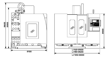 Specifications: | MODEL | LV65 | LV85 | LV105 | | TABLE | | | | | Table Size (mm) | 800 x 510 | 1000 x 510 | 1200 x 510 | | Travel Ranges (X x Y x Z mm) | 650 x 560 x 560 | 850 x 560 x 560 | 1020 x 560 x 560 | | Max. Table Load (kgs) | 600 | 600 | 600 | | Spindle Nose to Table Surface (mm) | 100 ~ 660 | 100 ~ 660 | 100 ~ 660 | | T-slot (Width x Distance x Number mm) | 18 x 100 x 5 | 18 x 100 x 5 | 18 x 100 x 5 | | SPINDLE | | | | | Distance Between Column (mm) | ISO40 | ISO40 | ISO40 | | Spindle Inner Diameter (mm) | Ø70 | Ø70 | Ø70 | | Spindle Center to Column (mm) | 600 | 600 | 600 | | Spindle Speed (rpm) Belt | 60 ~ 8000 (10,000) | 60 ~ 8000 (10,000) | 60 ~ 8000 (10,000) | | Spindle Speed (rpm) Gear | L40 ~ 2000, H2001 ~ 8000 | L40 ~ 2000, H2001 ~ 8000 | L40 ~ 2000, H2001 ~ 8000 | | Spindle Speed (rpm) Direct-Drive | 12000 | 12000 | 12000 | | Draw Bar Force (kgf) | 950 | 950 | 950 | | Main Motor (con/30 min Kw) | 5.5 / 7.5 | 5.5 / 7.5 | 5.5 / 7.5 | | FEED RATE | | | | | Rapid Feed Rate (X/Y/Z m/min) | 30 / 30 / 24 | 30 / 30 / 24 | 30 / 30 / 24 | | Feed Rate (X/Y/Z/ mm/min) | 10000 | 10000 | 10000 | | AXIS SERVOMOTOR | | | | | Mitsubishi X/Y/Z (Kw) | HF353 (3.5) | HF353 (3.5) | HF353 (3.5) | | Fanuc (Kw) | β22/2,000 i (2.5) or α12/3,000 i (3.0) | | Siemens (Kw) | 1FK7 063 (2.9) | 1FK7 063 (2.9) | 1FK7 063 (2.9) | | Fagor (Kw) | FKM64.30A | FKM64.30A | FKM64.30A | | Heidenhain (Kw) | QSY155B (2.47) | QSY155B (2.47) | QSY155B (2.47) | | AUTO TOOL CHANGER | | | | | ATC Type | PLATE / DISK | PLATE / DISK | PLATE / DISK | | Cam Type | GENOVA / DAUL ARM | GENOVA / DAUL ARM | GENOVA / DAUL ARM | | Tool Selection (Bi-direction) | ABSOLUTE / RANDOM | ABSOLUTE / RANDOM | ABSOLUTE / RANDOM | | Tool Storage Capacity (PCs) | 20 / 20 (24) | 20 / 20 (24) | 20 / 20 (24) | | Max. Tool Diameter (mm) | Ø100 / Ø93 (Ø90) | Ø100 / Ø93 (Ø90) | Ø100 / Ø93 (Ø90) | | Max. Tool Length (mm), Weight (kgs) | 250, 8 | 250, 8 | 250, 8 | | MISCELLANEOUS | | | | | Air Requirement (Kg/cm²) | 6 | 6 | 6 | | Voltage | 220 | 220 | 220 | | Power Requirement (KVA) | 15 | 15 | 20 | | Coolant Tank Capacity (L) | 200 | 200 | 200 | | Machine Weight (Kgs) | 4500 | 5200 | 5400 | | Machine Height (mm) | 2650 | 2650 | 2650 | | Floor Space (L x W mm) | 2600 x 2200 | 2600 x 2200 | 3000 x 2200 | | Packing Size (L x W x H mm) | 2650 x 2200 x 2400 | 2650 x 2200 x 2400 | 3050 x 2200 x 2400 |
