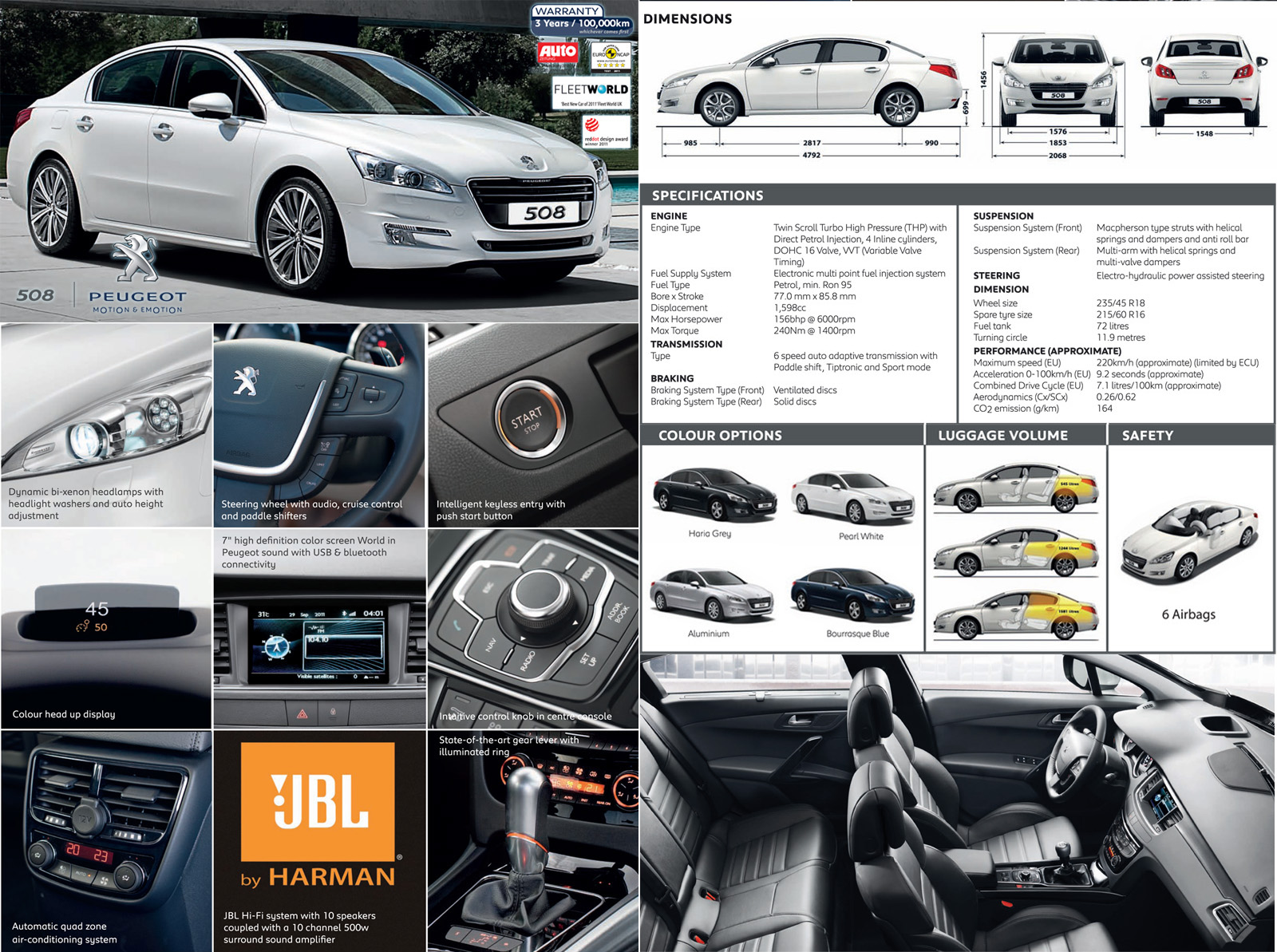 With elegance, strength and perfect balance, the styling suggests a vehicle sculpted from a single block. At the front, the 508 defines the new stylistic codes of Peugeot. The grille is "floating", giving the impression of being detached from the bodywork. Combining chrome and satin surfaces, the feline headlamps have been designed with partucular care with the signature circular LED day time running light. At the rear, three red tubes resembling claws in the tail lights shelter three rows of LEDs. The lines of the vehicle's sides are intentionally refined and set off by the satin chrome surround of the glazed surfaces.
